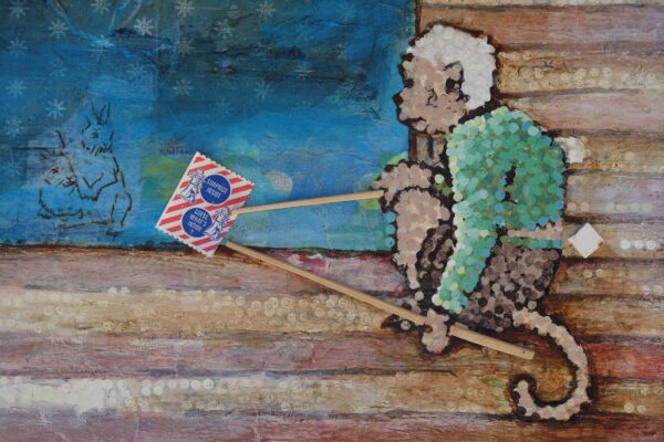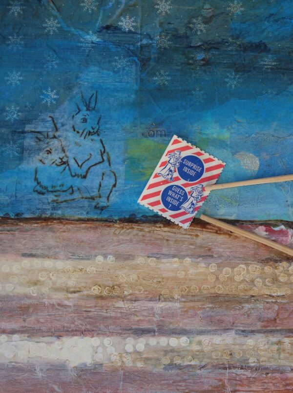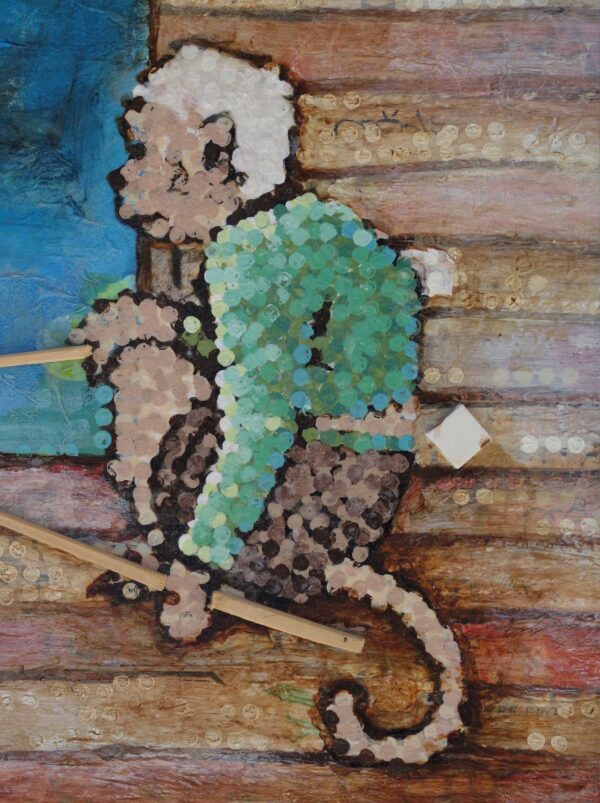 Chopsticks, Cracker Jack insert, tissue paper, napkins, LEGO 2×2 smooth tiles, ink, acrylic on canvas.