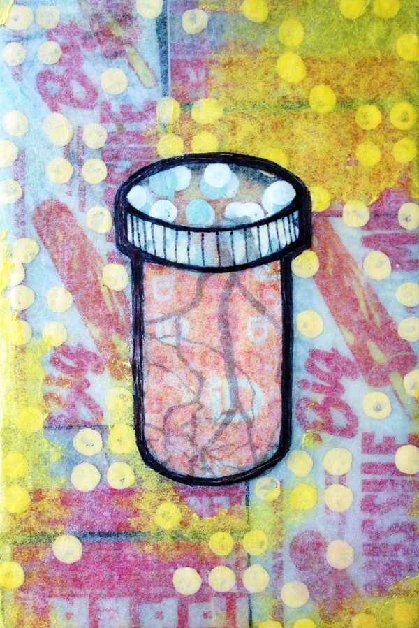 Yellow tissue, Stride ID gum wrapper, Big Missile Popsicle Wrapper, ink, acrylic on canvas.