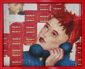 LEGO bricks, LEGO plates, chopsticks, balsa wood, medication stickers, ink, acrylic, spray paint on canvas.