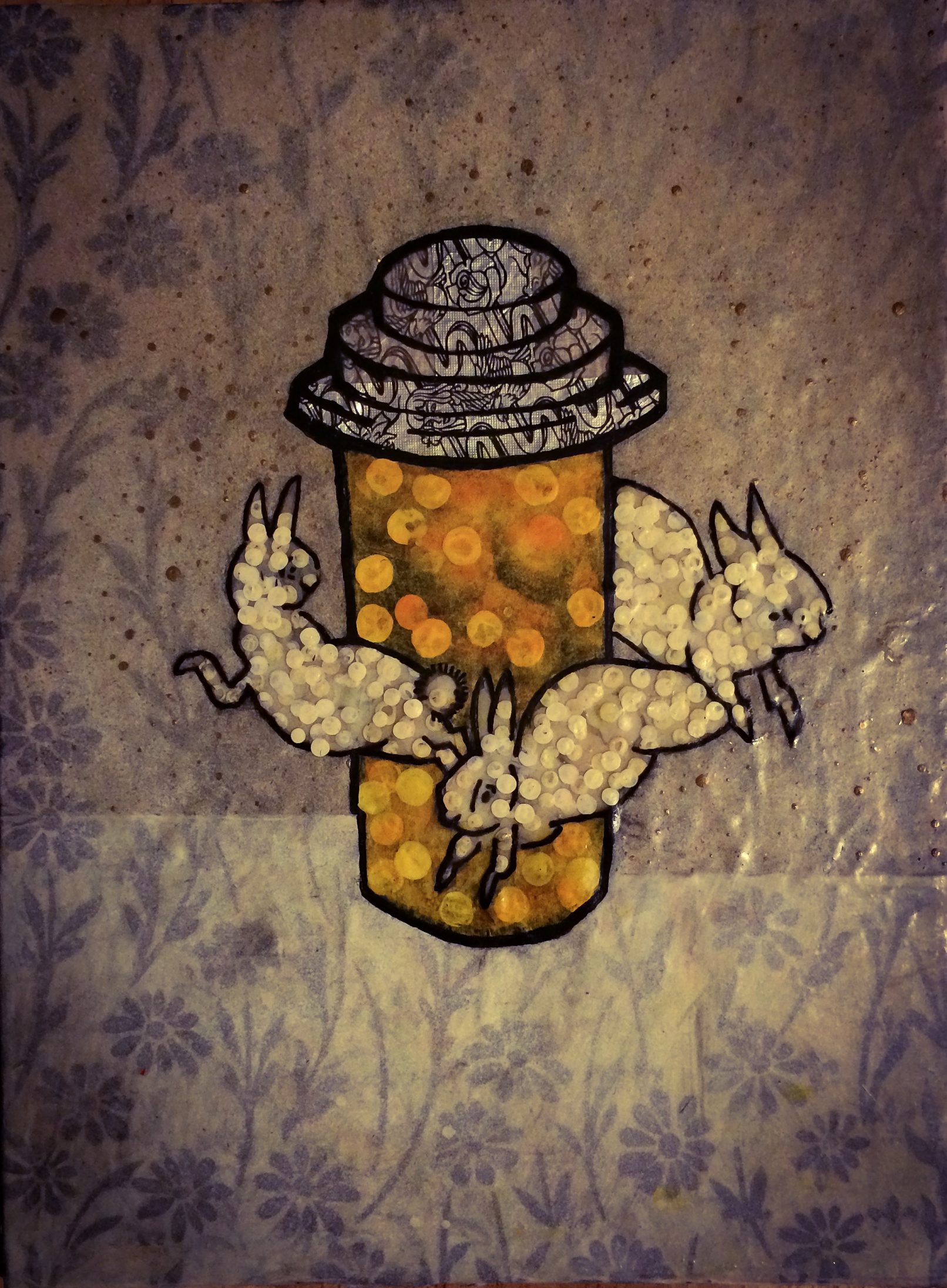 Tissue, ink, Juicy Fruit, Stride foil gum wrappers, acrylic on board.