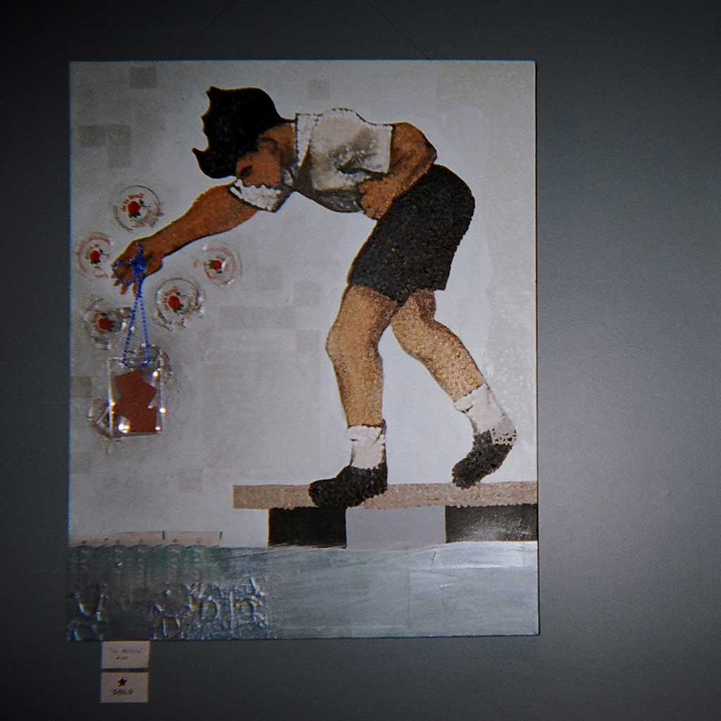 De La Rosa Mazapan candy wrappers, plastic badge holder, chain, napkins, foil, ink, acrylic on canvas.